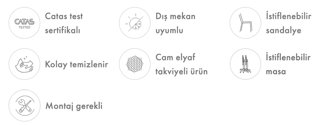 MOON MASA: Plastik tabla, katlanır mekanizma, ıstavroz, ayak ve alüminyum ayak borusu olarak çok komponentten oluşan ayak. Malzemeler: UV, Pigment ve Cam Elyaflı Polipropilen/Polyamit/Poliftalamid, ayarlanabilir ayak tapası, alüminyum boru ve paslanmaz metal bağlantı elemanları. Plastik yüzeyler mat ve yüksek aşınma dayanımlı pütürlü. Metal yüzey özel işlem görmüş parlak, solvent madde içermeyen toz boya. Kaydırmaz ayak.