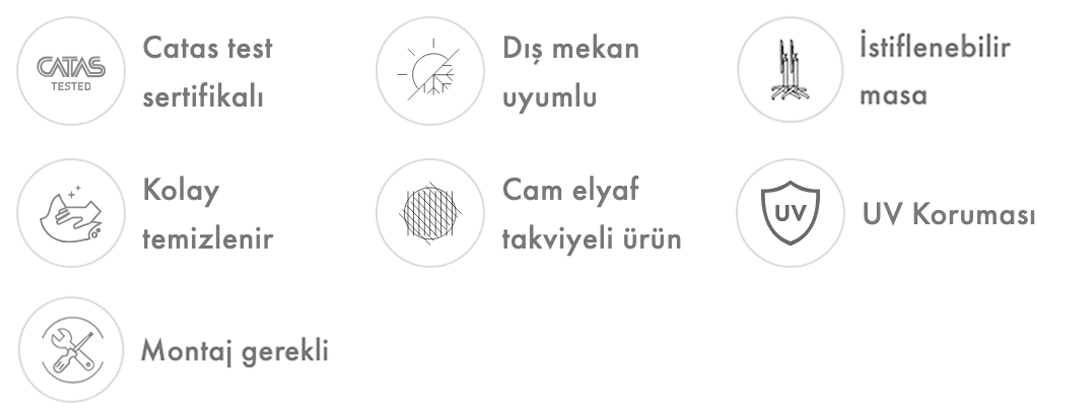 MOON MASA: Plastik tabla, katlanır mekanizma, ıstavroz, ayak ve alüminyum ayak borusu olarak çok komponentten oluşan ayak. Malzemeler: UV, Pigment ve Cam Elyaflı Polipropilen/Polyamit/Poliftalamid, ayarlanabilir ayak tapası, alüminyum boru ve paslanmaz metal bağlantı elemanları. Plastik yüzeyler mat ve yüksek aşınma dayanımlı pütürlü. Metal yüzey özel işlem görmüş parlak, solvent madde içermeyen toz boya. Kaydırmaz ayak.