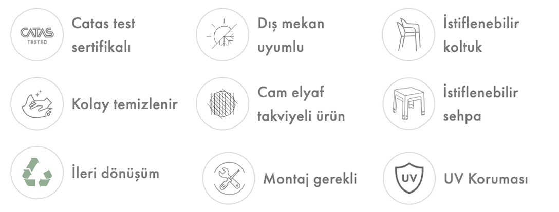 DUO KOLTUK: Monoblok ayaklı plastik iskelet, sırt ve oturak olarak çok komponentten oluşan istiflenebilir kolçaklı sandalye. Tüm yüzeyler yüksek aşınma dayanımlı mat ve pütürlü. Malzemeler : İskelet, Sırt ve Oturak : UV, pigment ve cam elyaflı polipropilen, Ayak Tıpası : Natural PVC'den kaydırmaz, (Sıkı geçme uygulama) Bağlantı Elemanları : Paslanmaz metal