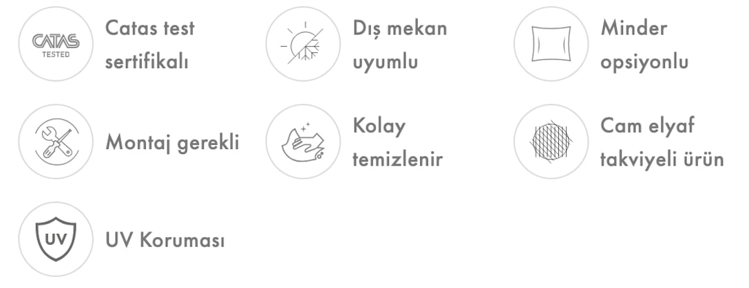 Plastik sehpası, oturaklar, minderler, sırtlar ve kollu veya kolsuz ayak bağlantıları olarak çok kompenentten oluşan ve isteğe göre tekli, çiftli ve üçlü olarak montajlanabilen Koltuk Seti Malzemeler: UV, Pigment ve Cam elyaflı Polipropilen ve Döşemelik kumaş ve sünger. Ayak tapaları ve plastik bağlantı elemanları. Kumaş kaplı minder.